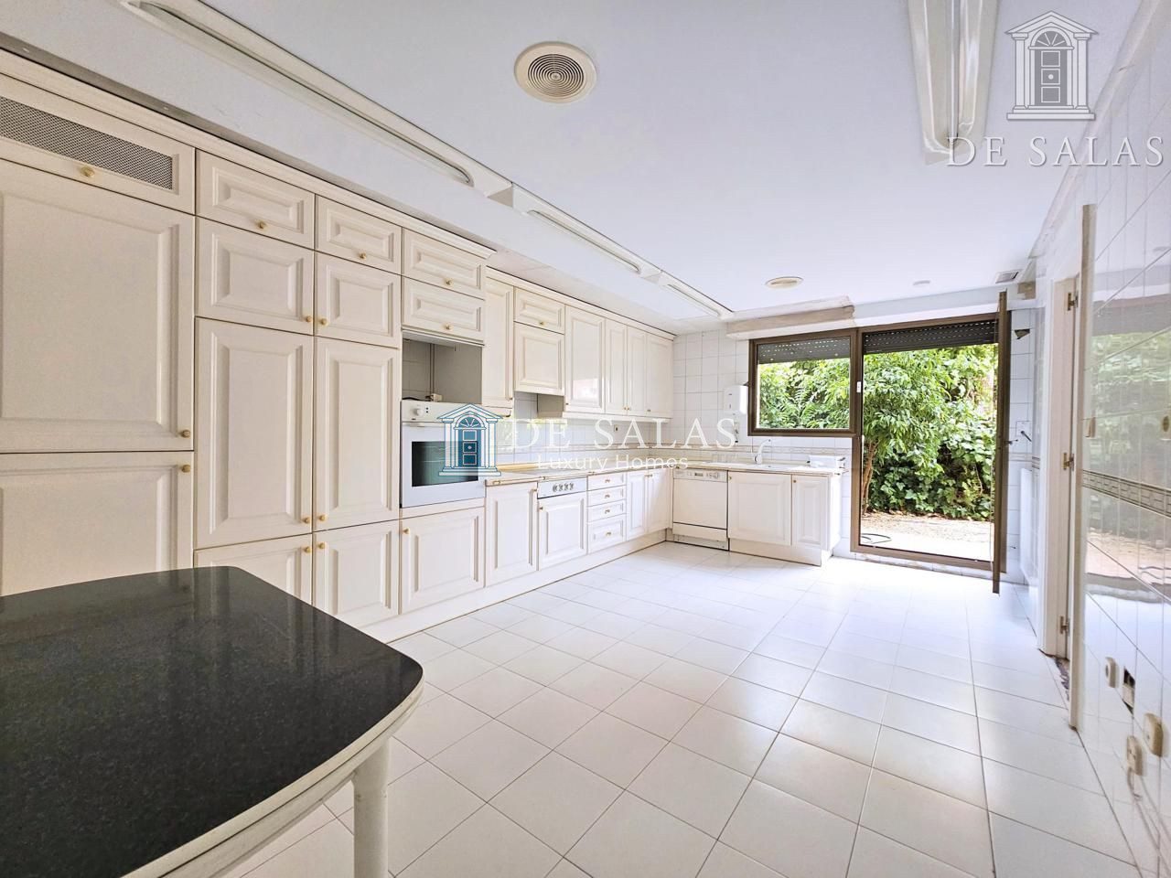 La cocina, de gran tamaño, con zona para mesa de diario, tiene salida al jardín trasero, por lo que puede ser muy útil si se quiere disponer de un comedor de verano al aire libre.