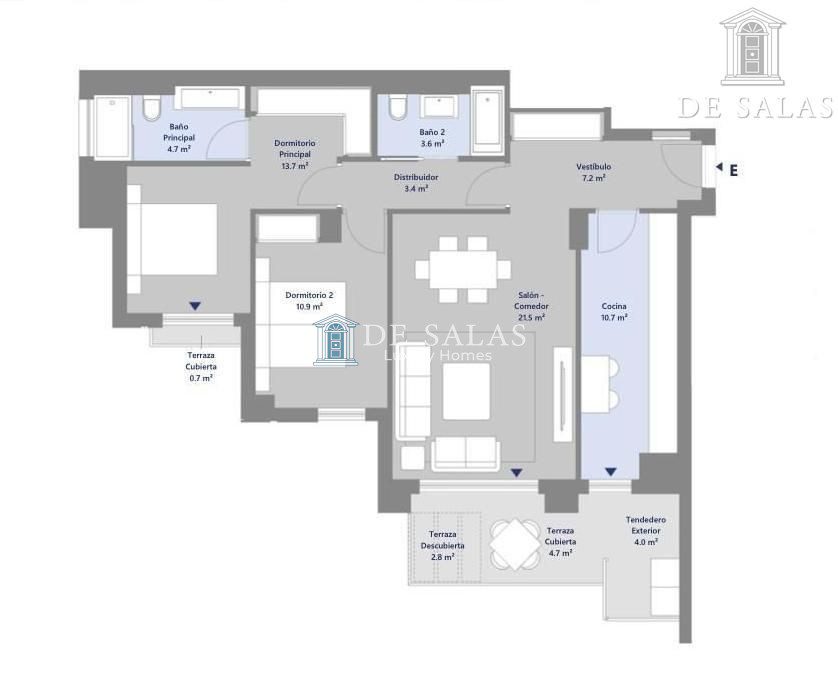 Este elegante piso de obra nueva destaca por una distribución equilibrada y funcional, pensada para maximizar el confort y la calidad de vida. Dispone de dos dormitorios, uno de ellos en suite, con vestidor y acceso directo a una terraza privada, creando un espacio íntimo y acogedor.