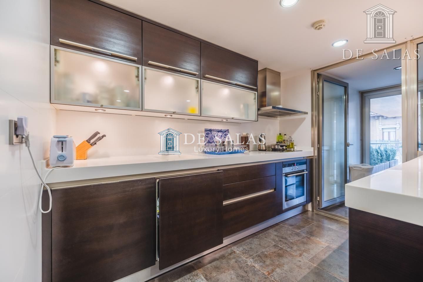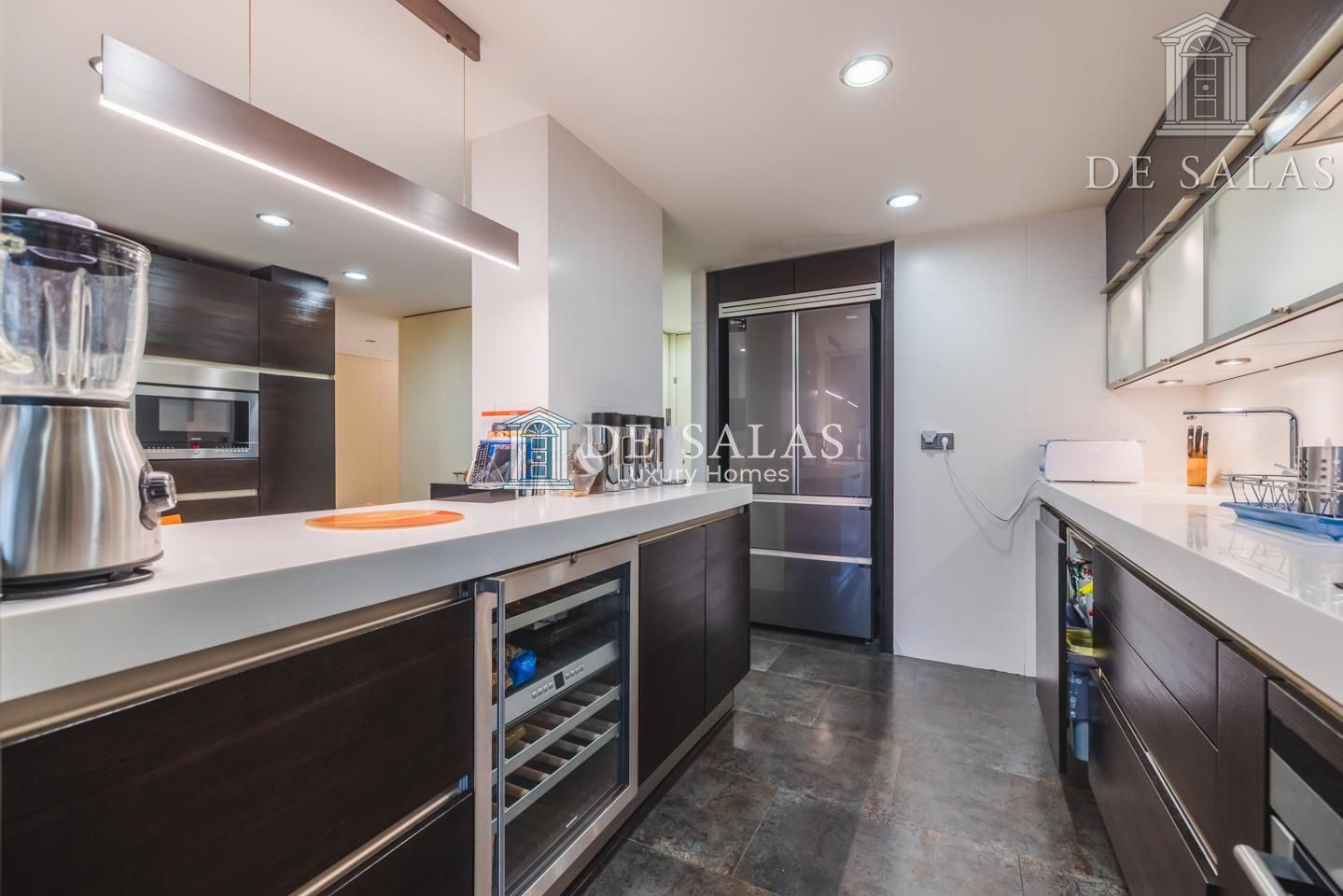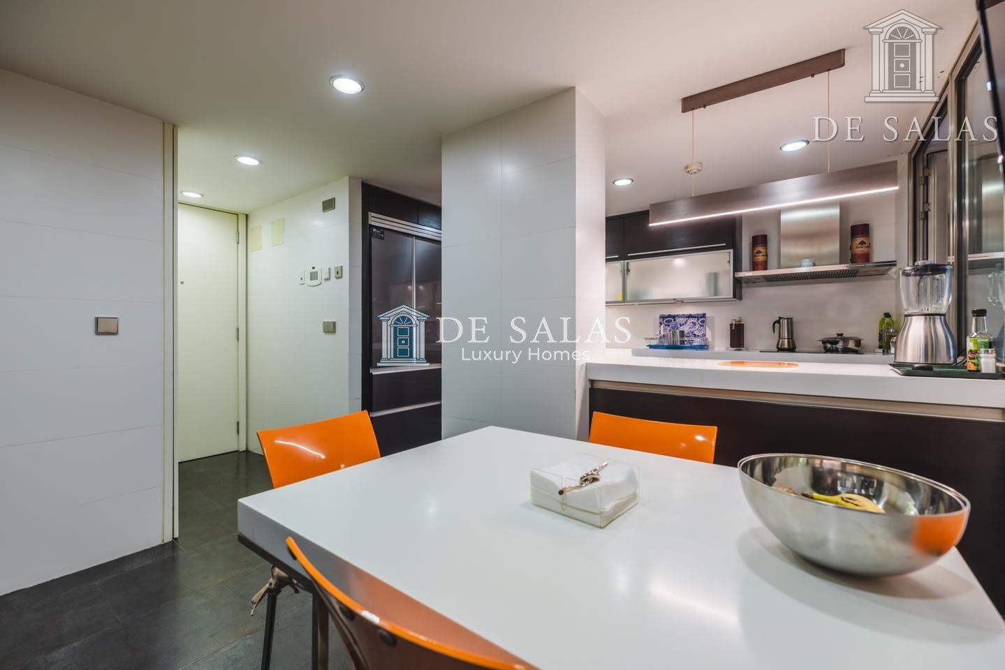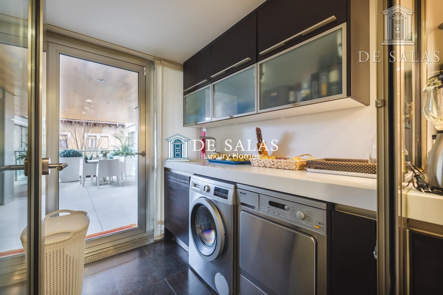 La cocina cuenta con una zona independiente destinada a office, con muchos armarios para almacenaje y área desayunador. La comodidad de esta cocina se completa con el espacio de trabajo, con encimera de Corian, frigorífico americano y vinoteca integrada. Además dispone de zona destinada a lavandería y puerta de servicio. Desde la cocina tenemos salida a una segunda terraza de 15m2, perfecta para comer y cenar en los meses más cálidos y soleados del año.
