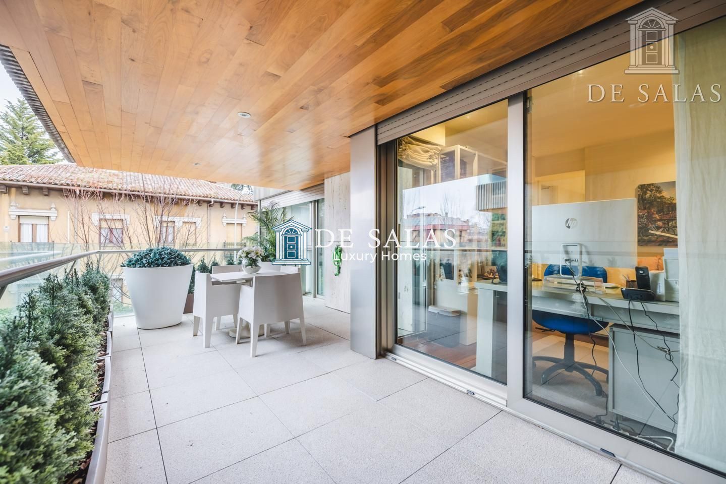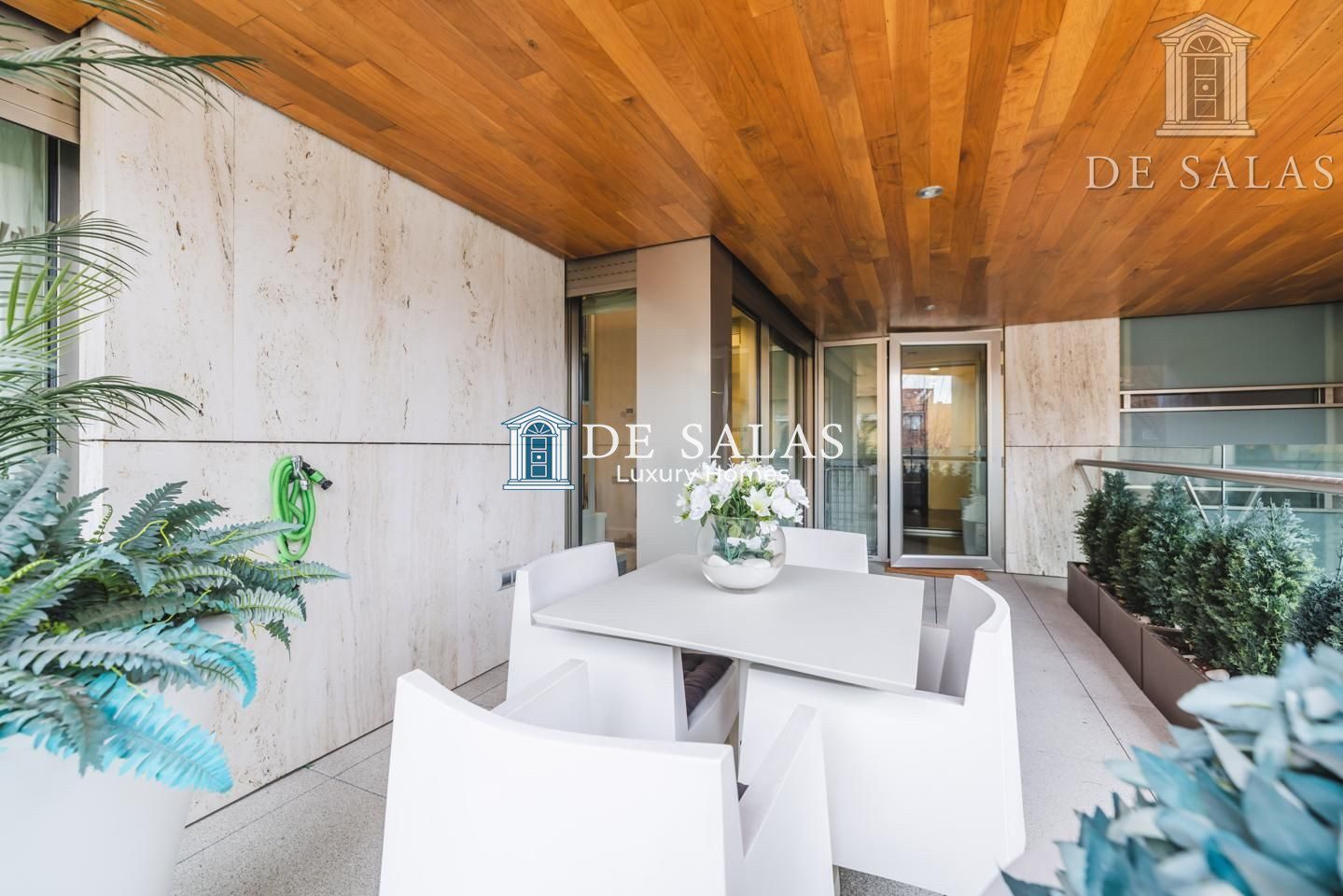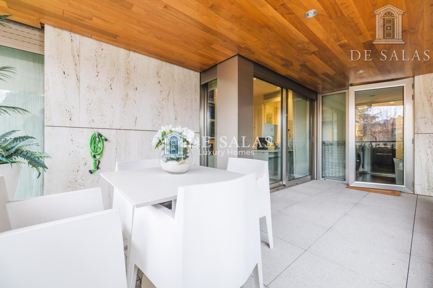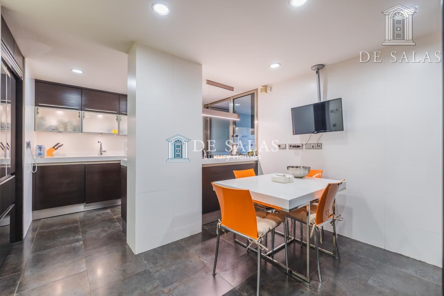 La cocina cuenta con una zona independiente destinada a office, con muchos armarios para almacenaje y área desayunador. La comodidad de esta cocina se completa con el espacio de trabajo, con encimera de Corian, frigorífico americano y vinoteca integrada. Además dispone de zona destinada a lavandería y puerta de servicio. Desde la cocina tenemos salida a una segunda terraza de 15m2, perfecta para comer y cenar en los meses más cálidos y soleados del año.