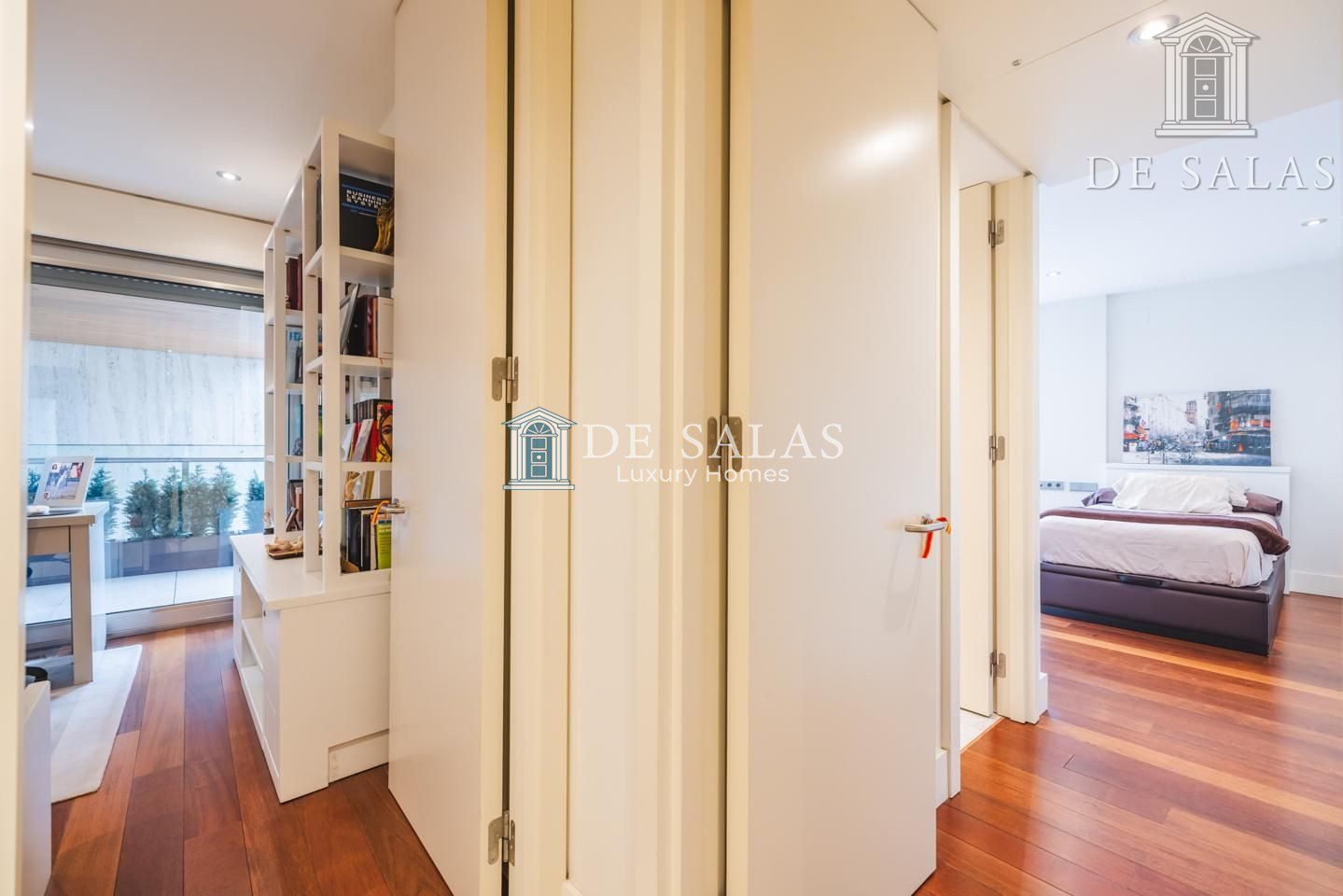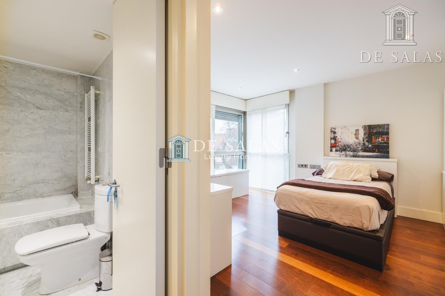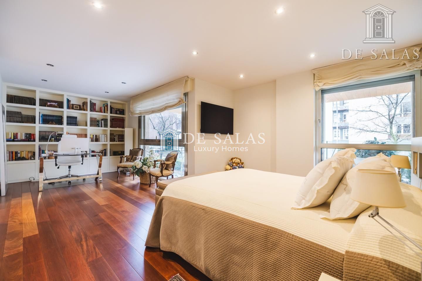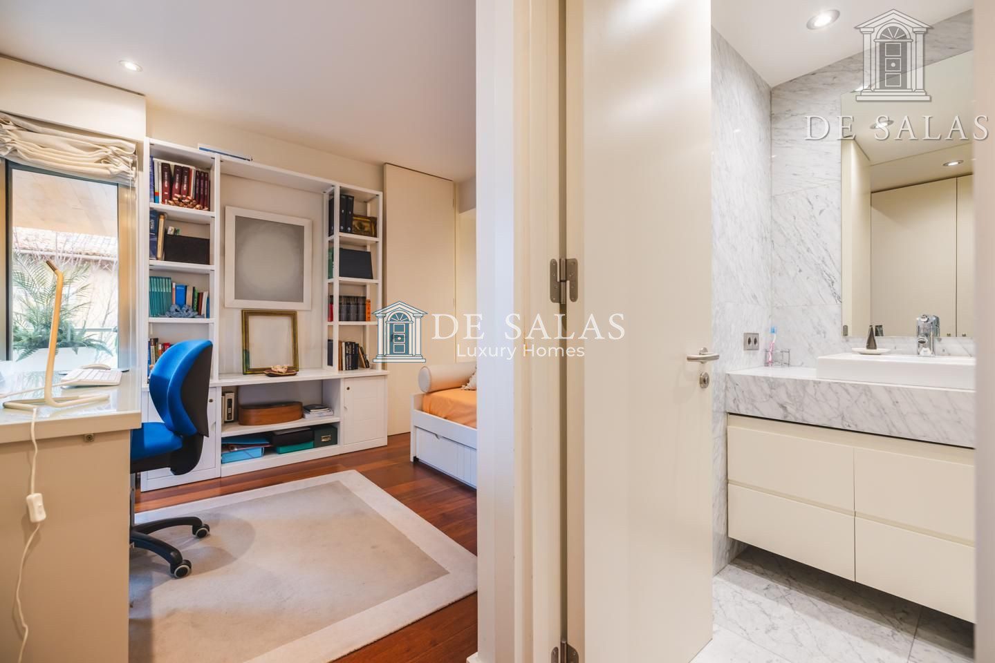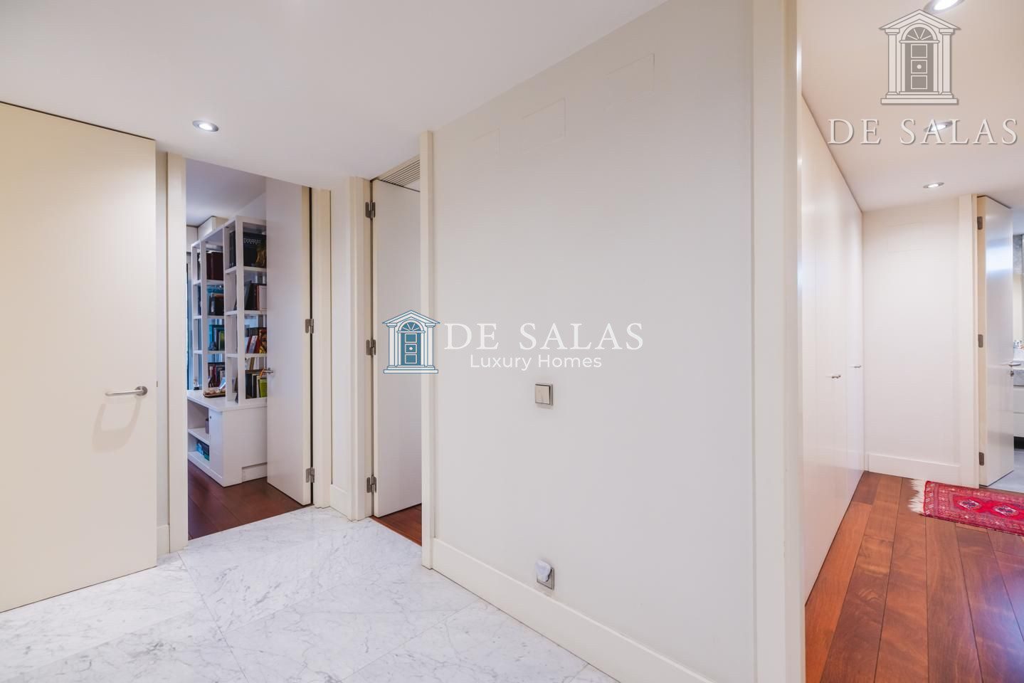 La zona de noche se encuentra completamente separada por una puerta que permite el descanso en cualquier momento. El dormitorio principal, de grandes dimensiones, cuenta con numerosos armario empotrados, además de un closet-vestidor y una zona de despacho tras una preciosa librería confeccionada a medida. El cuarto de baño en suite, de elegante mármol, tiene un amplio mueble lavabo de 2 senos, bañera y ducha, además del inodoro y bidé.