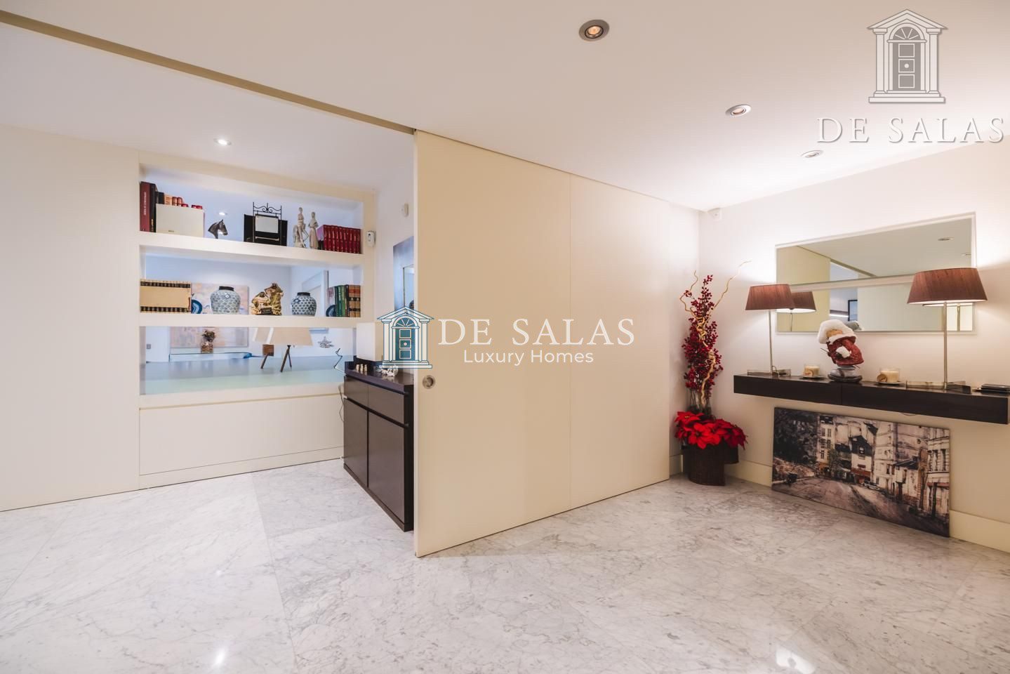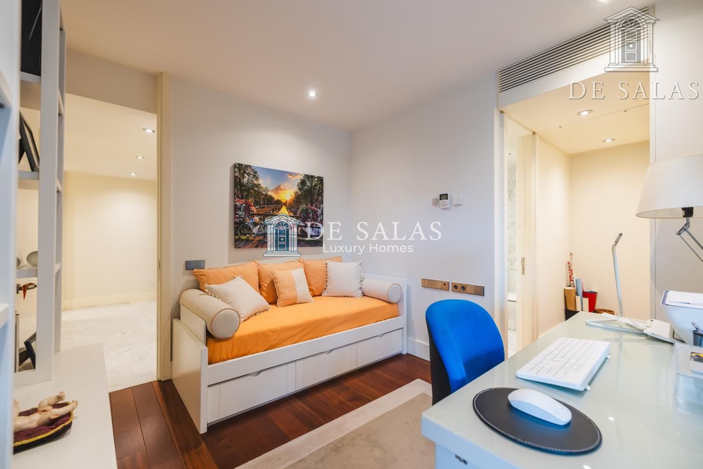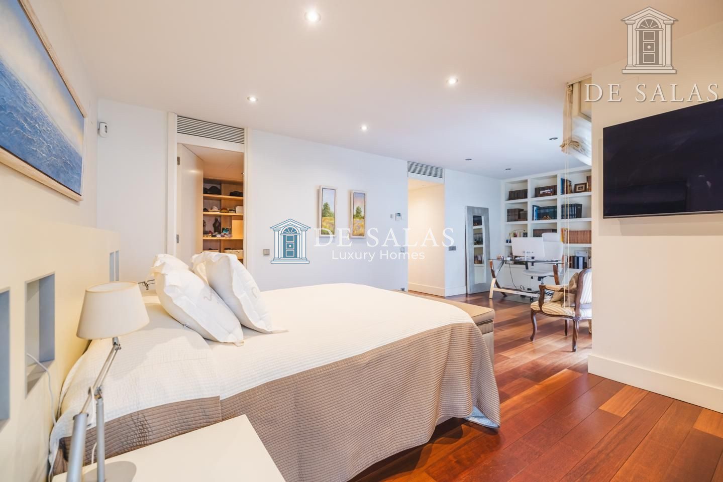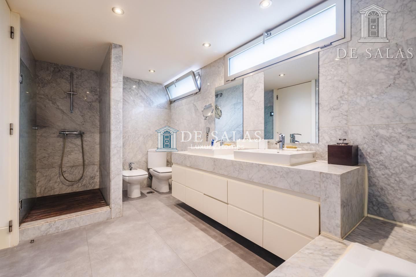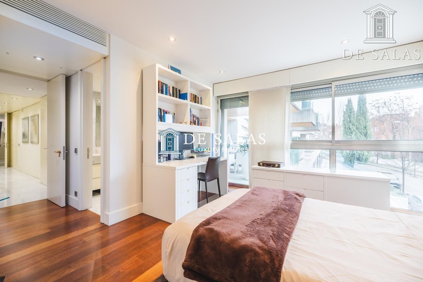 La zona de noche se encuentra completamente separada por una puerta que permite el descanso en cualquier momento. El dormitorio principal, de grandes dimensiones, cuenta con numerosos armario empotrados, además de un closet-vestidor y una zona de despacho tras una preciosa librería confeccionada a medida. El cuarto de baño en suite, de elegante mármol, tiene un amplio mueble lavabo de 2 senos, bañera y ducha, además del inodoro y bidé.