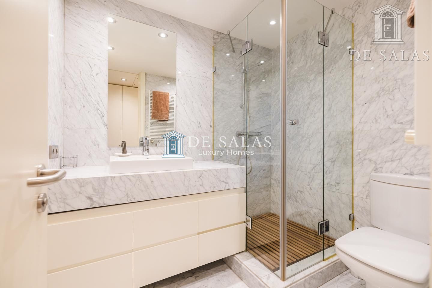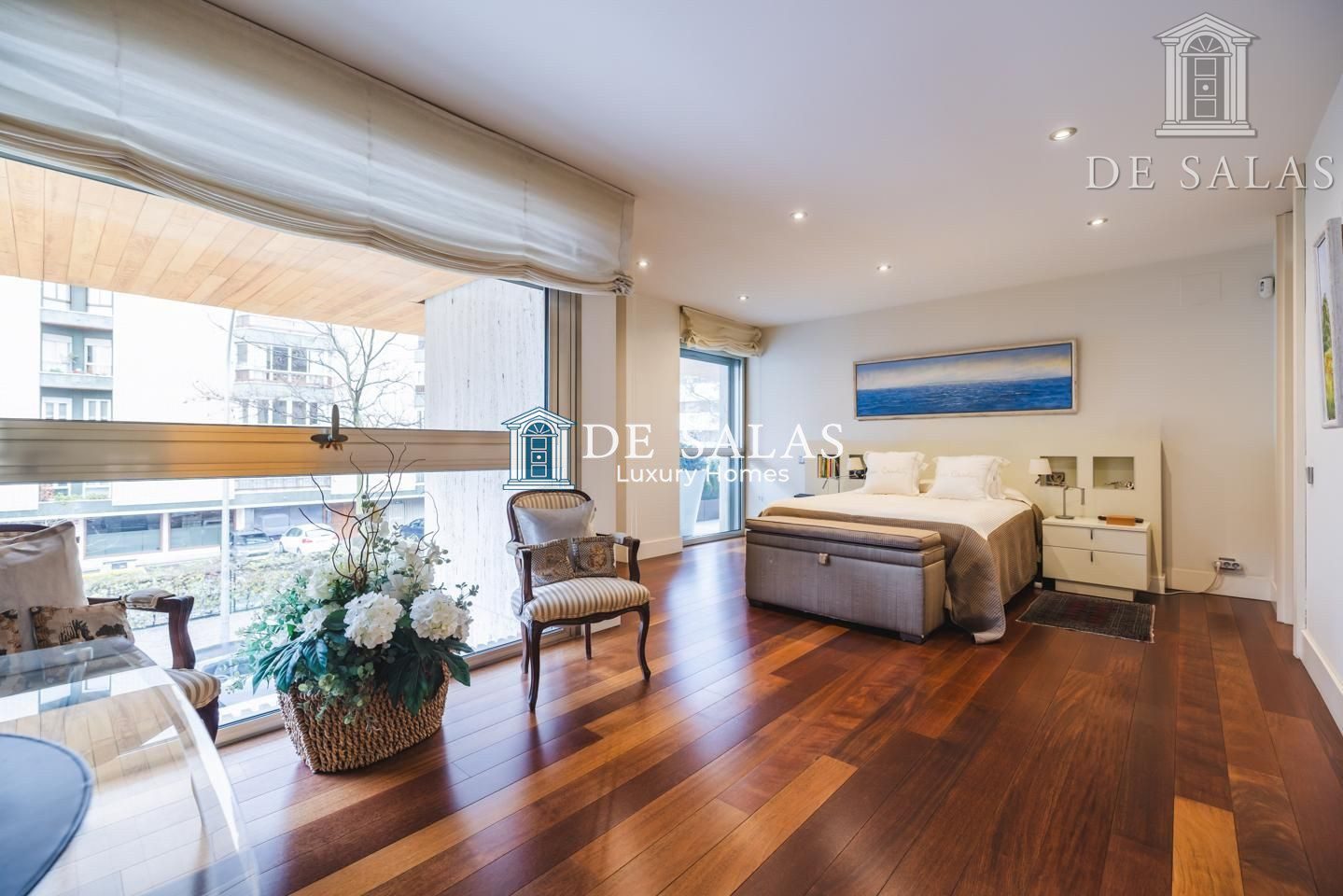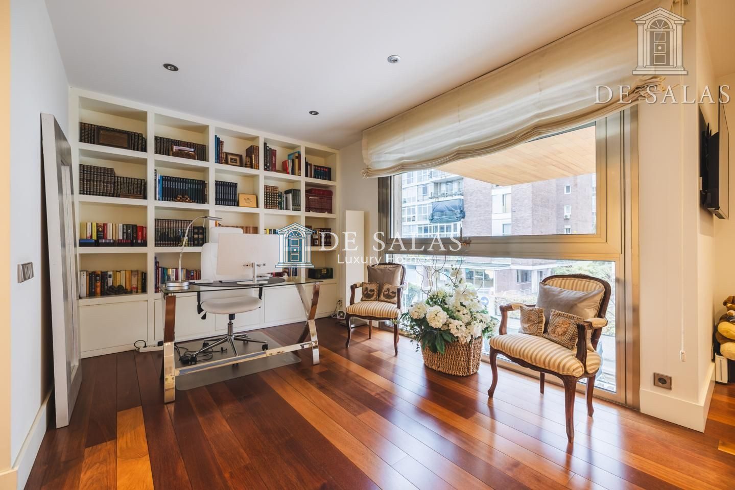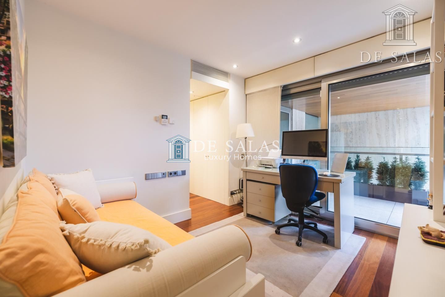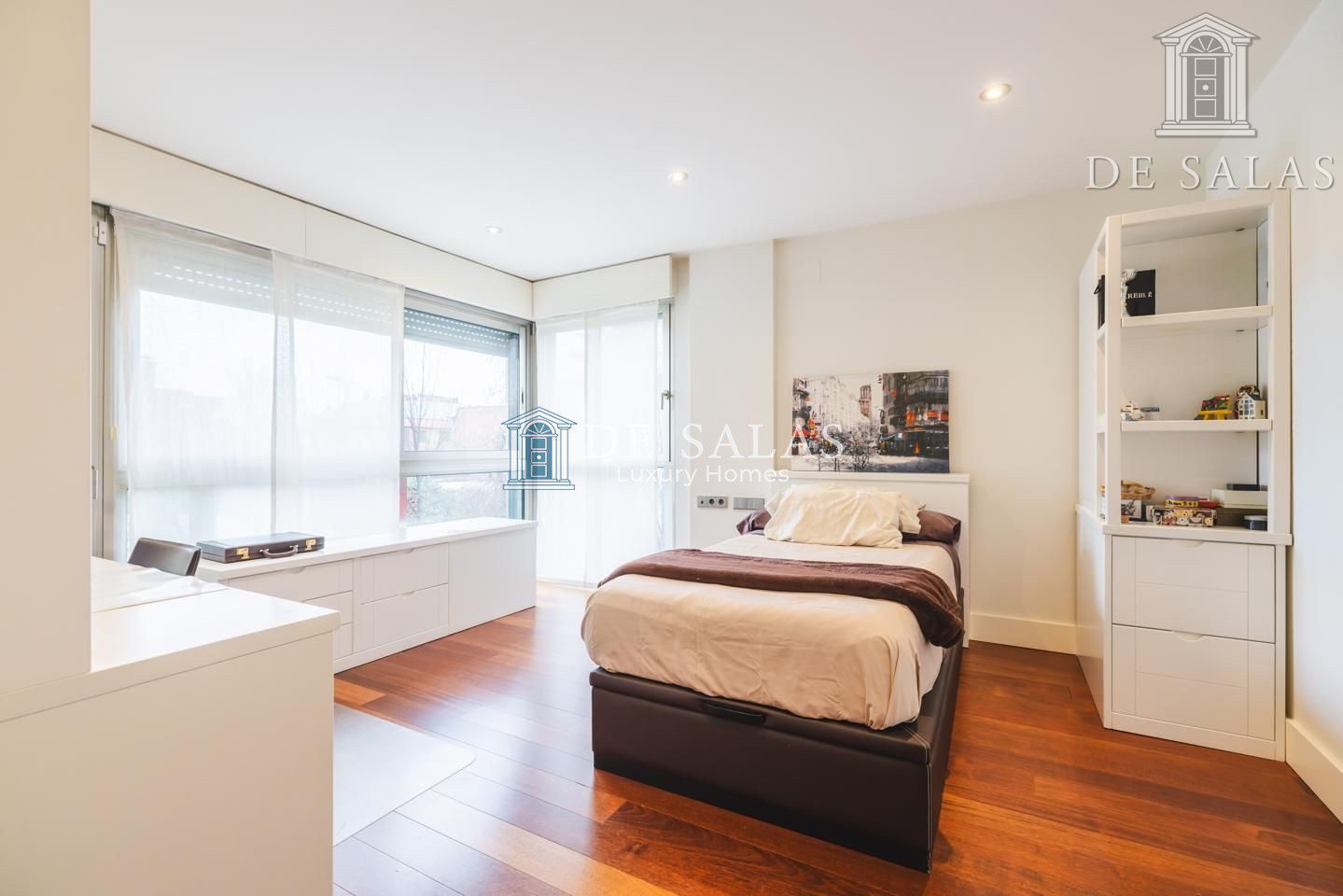 La zona de noche se encuentra completamente separada por una puerta que permite el descanso en cualquier momento. El dormitorio principal, de grandes dimensiones, cuenta con numerosos armario empotrados, además de un closet-vestidor y una zona de despacho tras una preciosa librería confeccionada a medida. El cuarto de baño en suite, de elegante mármol, tiene un amplio mueble lavabo de 2 senos, bañera y ducha, además del inodoro y bidé.