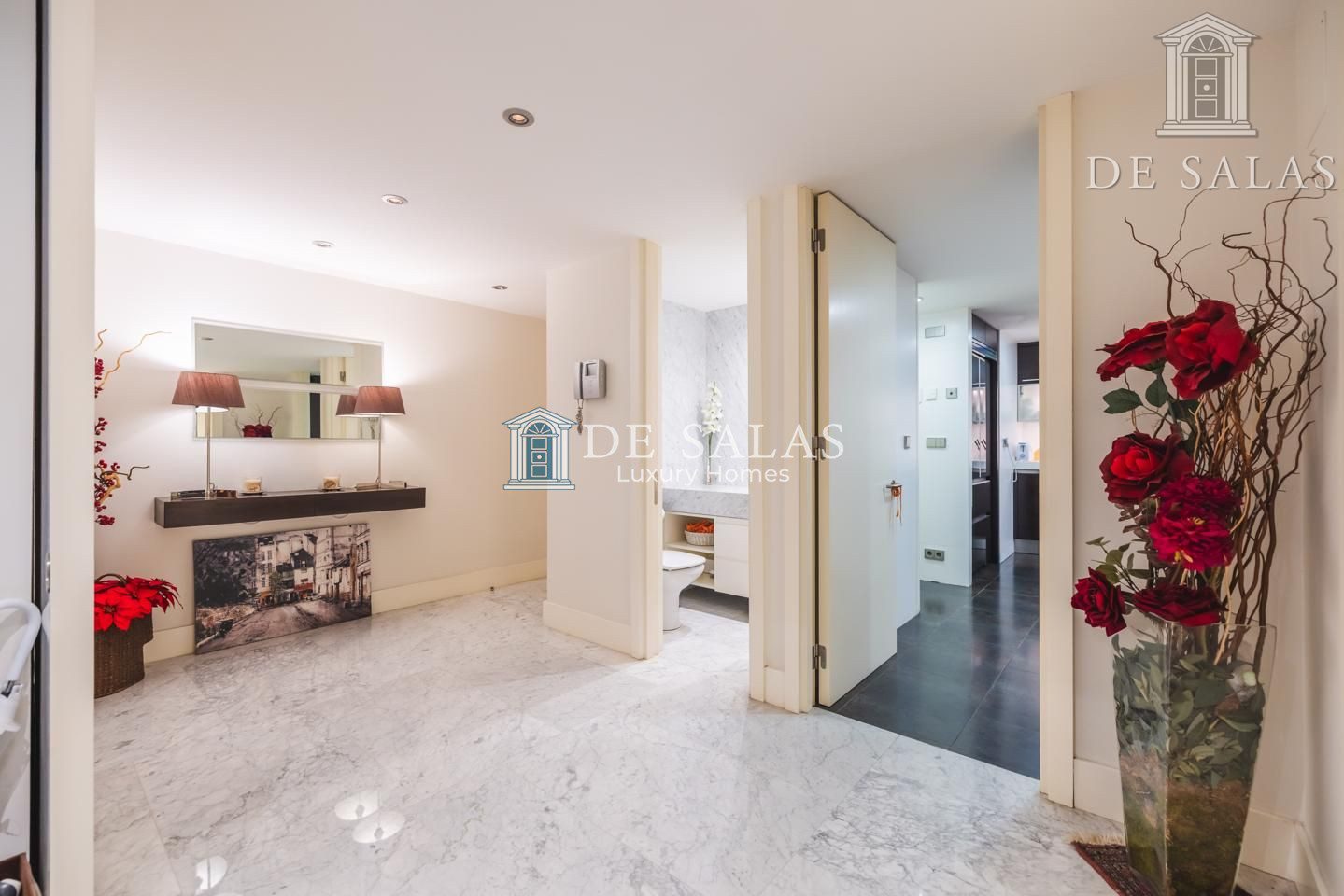 El amplio hall de entrada, con aseo para invitados, ya nos indica que nos hallamos en una vivienda de amplísimos espacios diáfanos, con una maravillosa luz natural gracias a las cristaleras de todas las ventanas y puertas de acceso a terrazas.