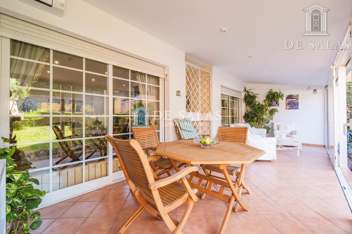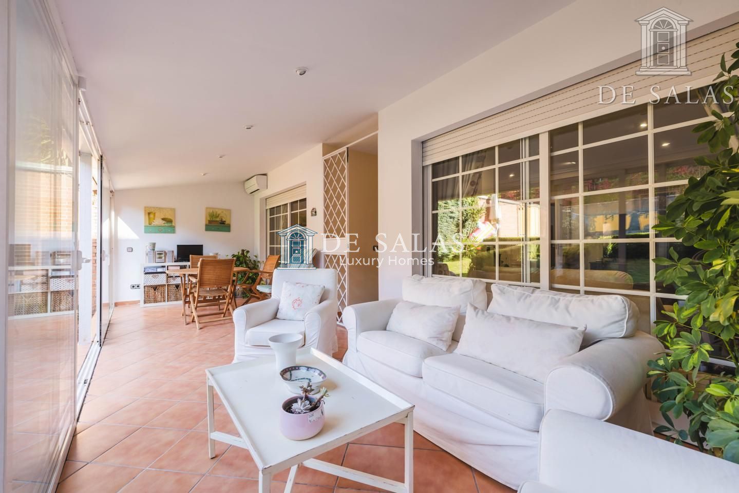 Junto a la cocina se encuentra el comedor independiente (16m2), que puede destinarse a despacho si se desea, y el salón (37m2) con chimenea permite decorarlo en 2 ambientes diferenciados. Desde aquí salimos a un estupendo porche cerrado (22m2), ideal para disfrutar de las vistas al jardín durante todo el año, ya que dispone de climatización propia. Éste cuenta en la actualidad con una zona de comedor y otra de sala de estar.