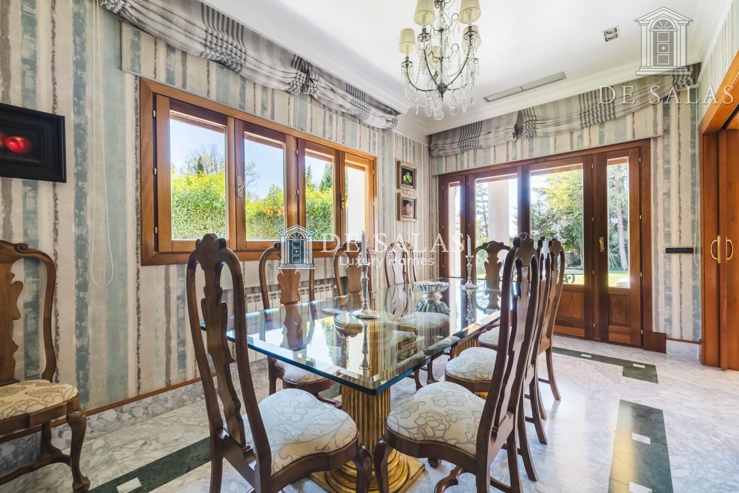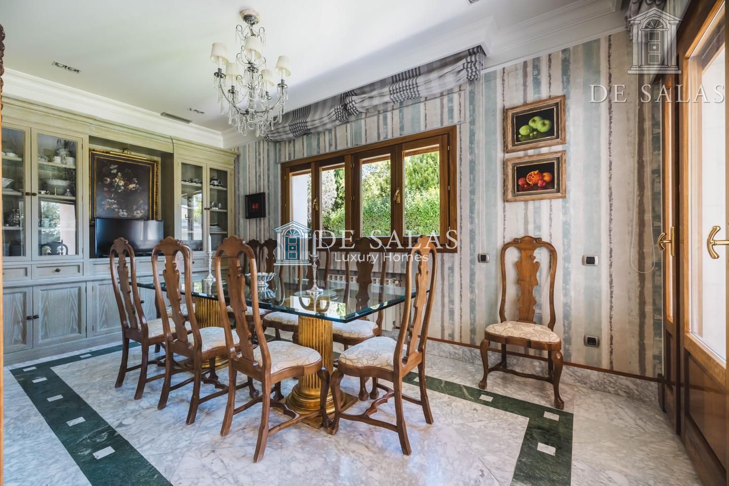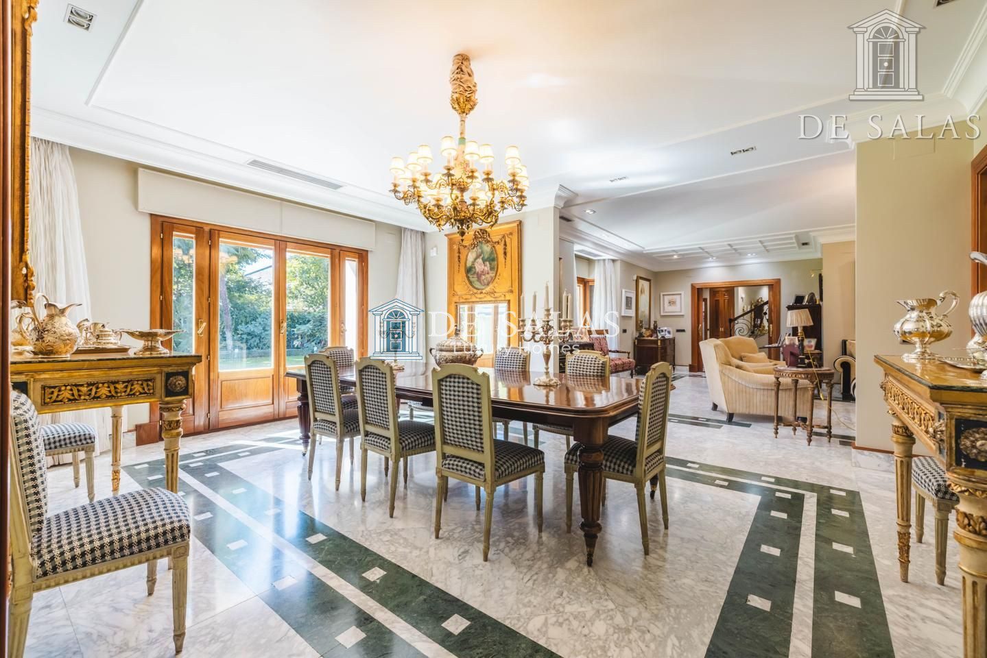 El salón, de generosas dimensiones, se une al comedor para celebraciones y éste a su vez comunica con el comedor de diario con salida directa al jardín.
