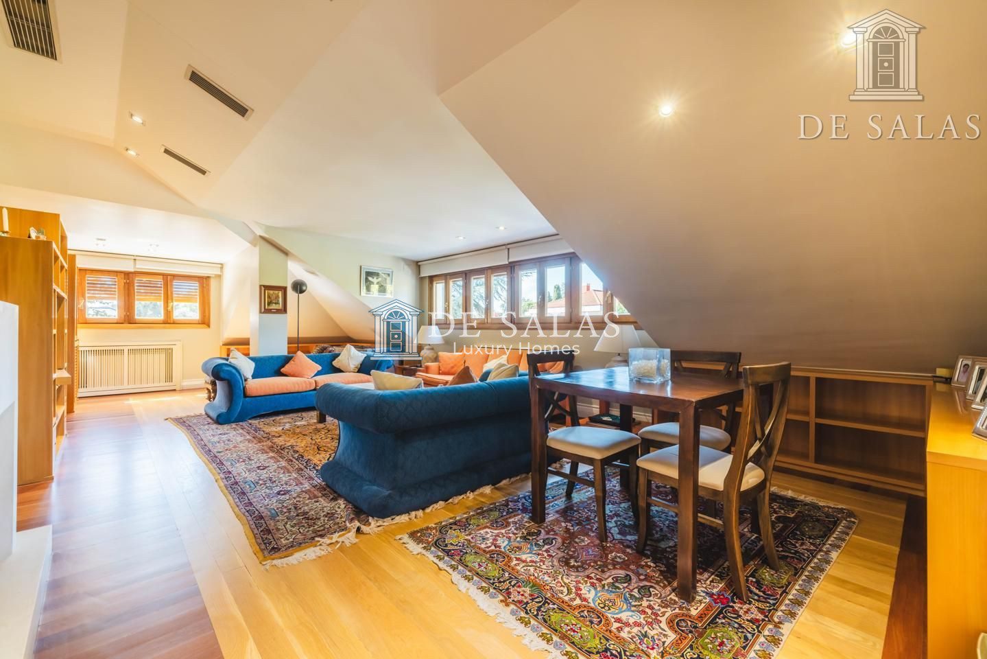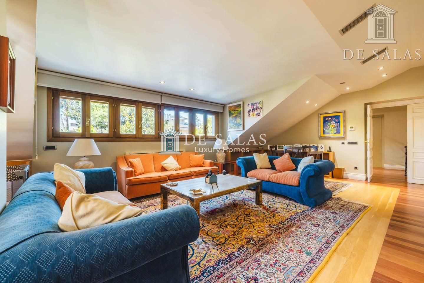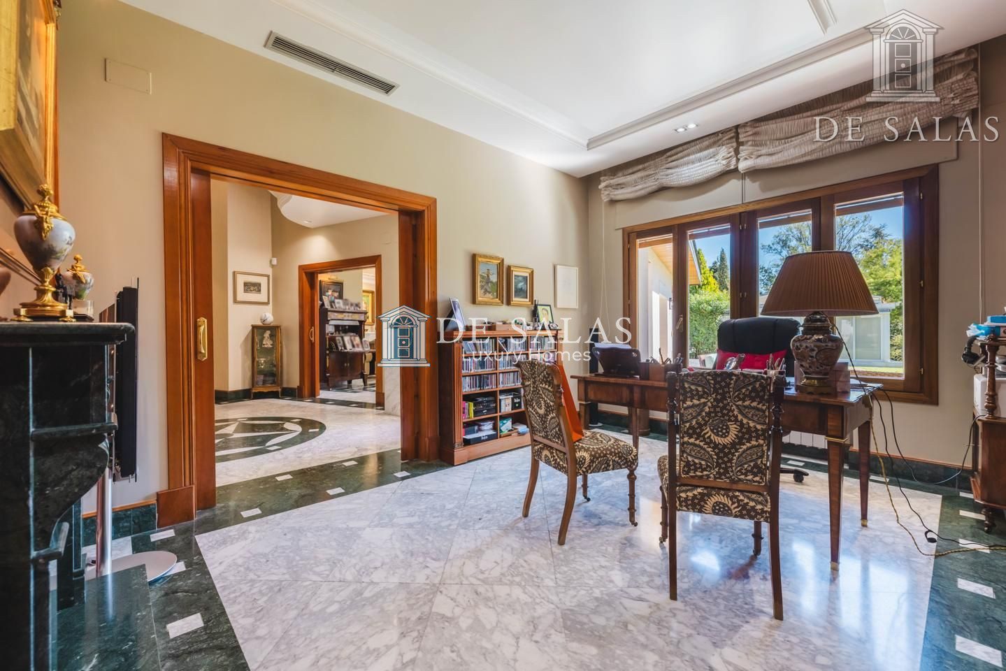 El salón, de generosas dimensiones, se une al comedor para celebraciones y éste a su vez comunica con el comedor de diario con salida directa al jardín.