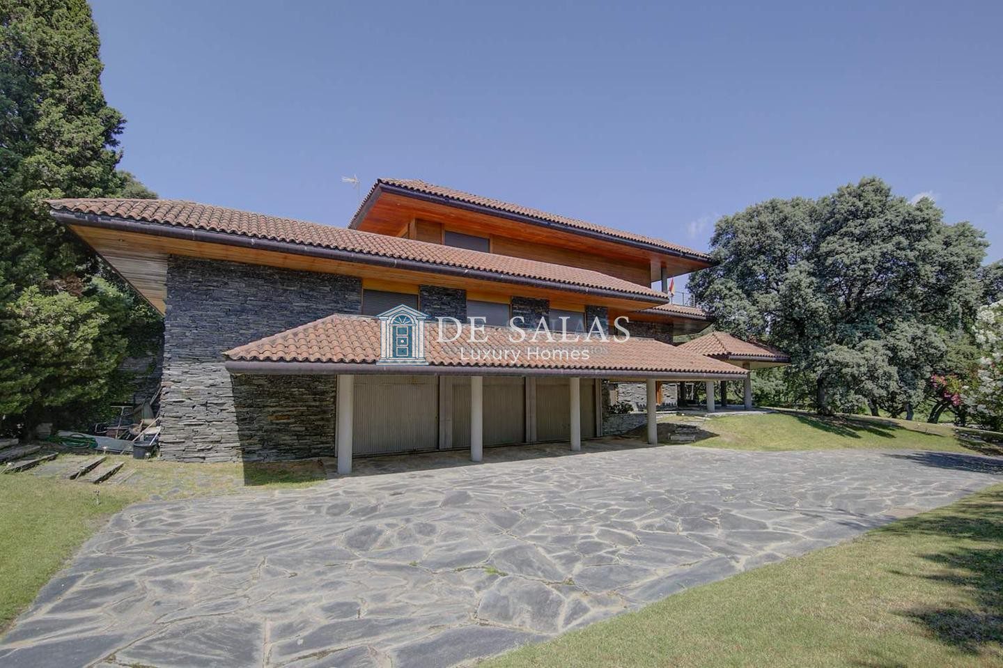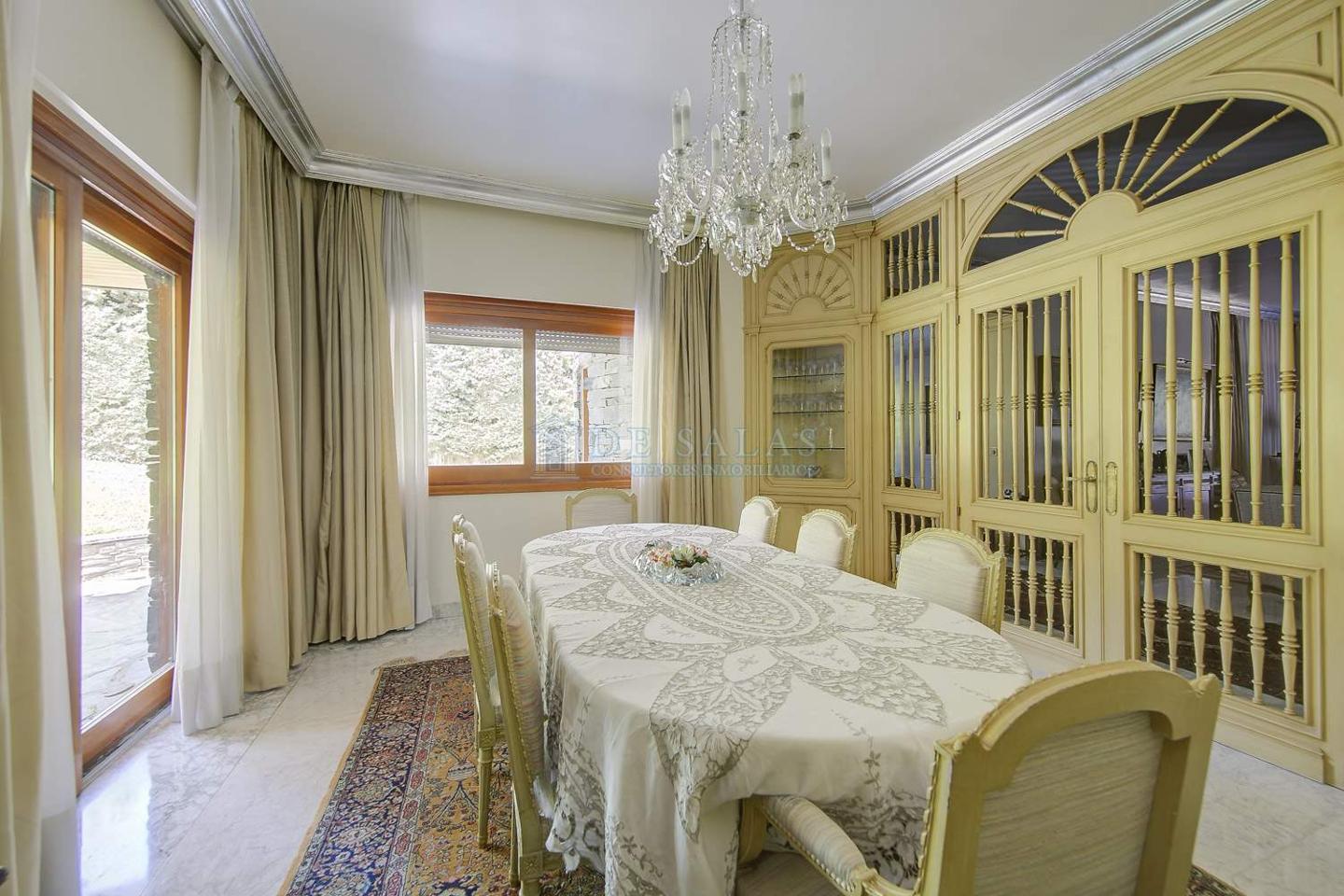 En su distribución, encontrarás un amplio salón en dos niveles con chimenea y despacho, cinco dormitorios y cinco baños, una cocina completamente equipada, lavandería, cuarto de servicio y baño. La planta -1 alberga un gran salón y discoteca, bodega, caja fuerte, cuarto de calderas, trastero, antena parabólica, sistema de alarma y un garaje con capacidad para seis plazas.