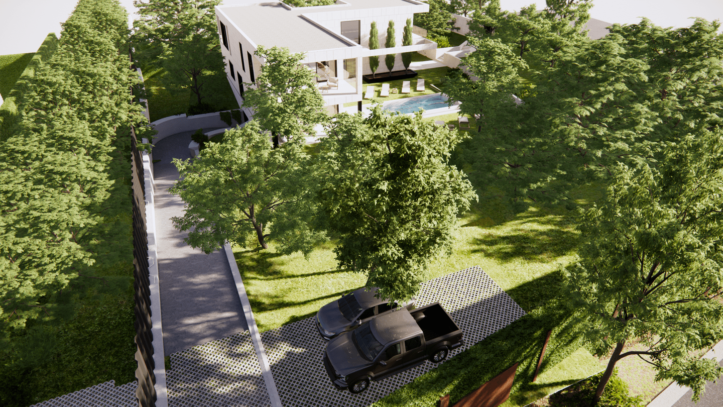Un espacioso garaje para dar cabida a cuatro coches, con toma de corriente para coche eléctrico, y una zona de aparcamiento exterior para tres coches.