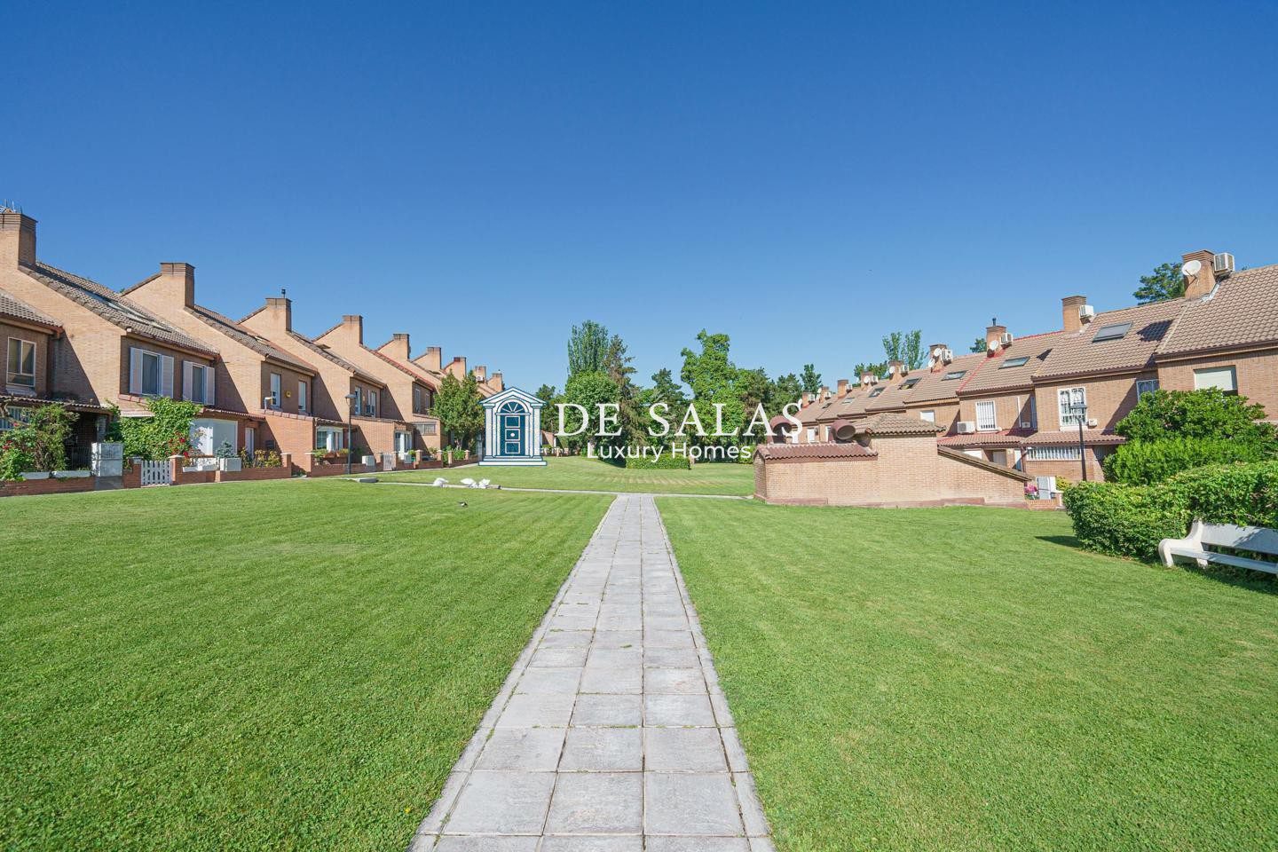 Planta baja: Luminoso salón-comedor diáfano de 90 m2 con chimenea, aseo de cortesía, cuarto de servicio -plancha y lavandería- . Bonita y amplia cocina con isla y office, que se comunica directamente con el salón. Acceso directo desde el salón comedor a precioso jardín privado de 75m2 con pérgola, y puerta de jardín con salida a la calle. Vistas privilegiadas al parque. Vidrios y persiana de seguridad. La puerta principal, está situada junto a la cocina y da a un patio delantero de 20m2 con salida a la urbanización, zonas comunes y piscina.