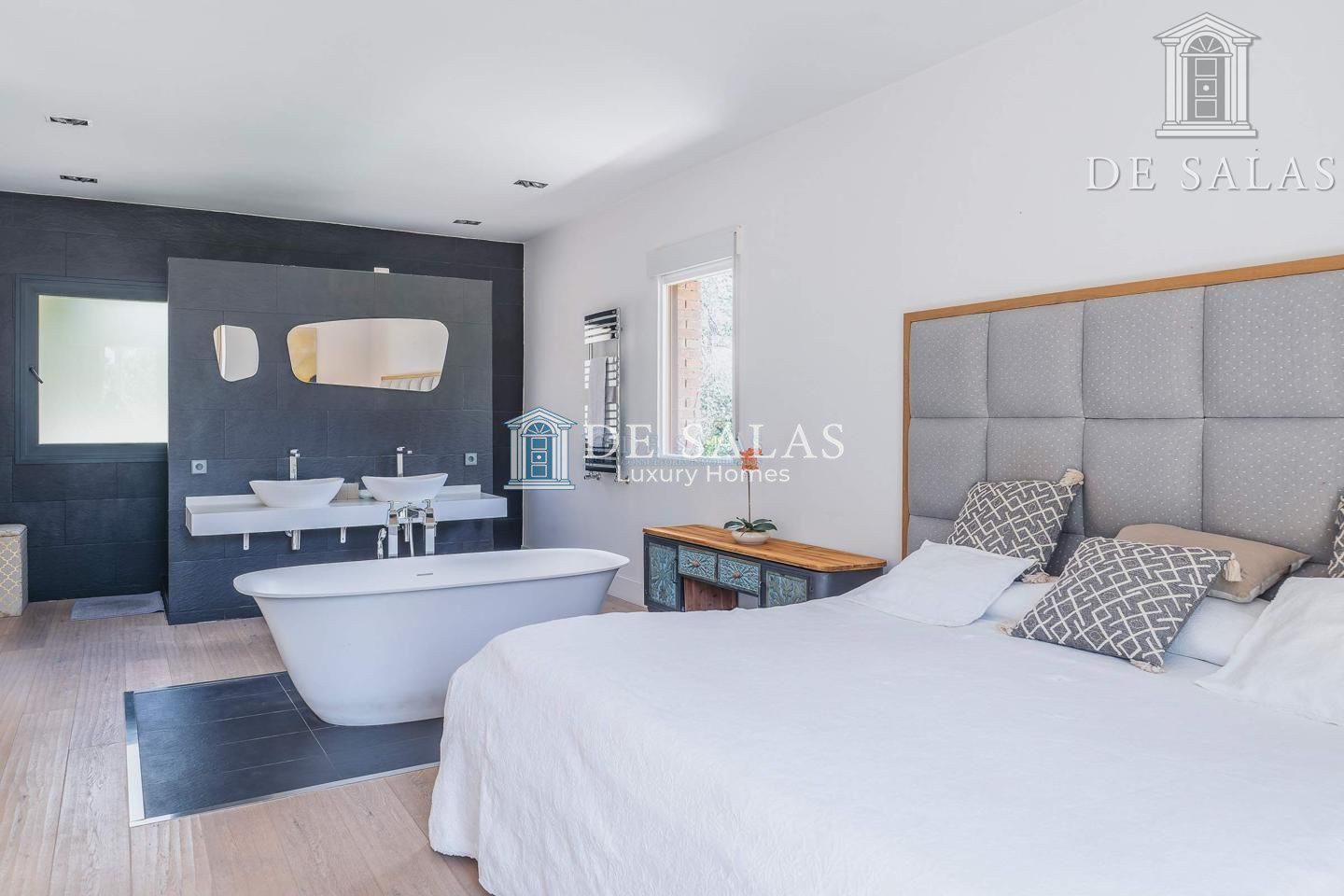 – 2 Dormitorios y 2 baños (los dos con baño en suite y uno de ellos con doble vestidor y ampliado con un despacho en bajo buhardilla)