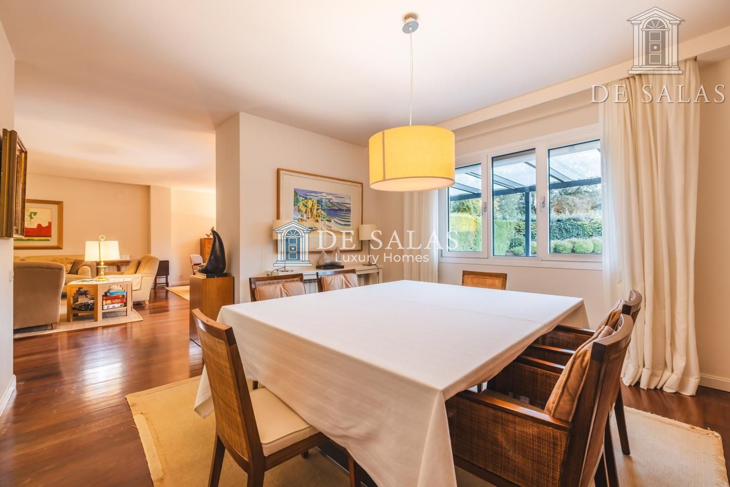 Desde el hall principal se accede directamente al salón/ comedor. La zona de comedor fluye con el resto de la estancia manteniendo al mismo tiempo su propio espacio perfectamente definido. Tanto el comedor como el salón tienen vistas y acceso al espectacular porche cubierto.
