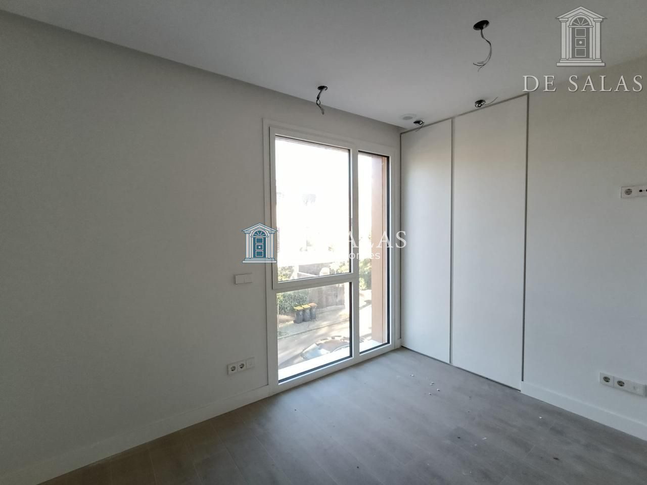 Puertas interiores de suelo a techo en color blanco con cierre magnético y bisagras ocultas. Armarios totalmente revestidos con barra y cajoneras.