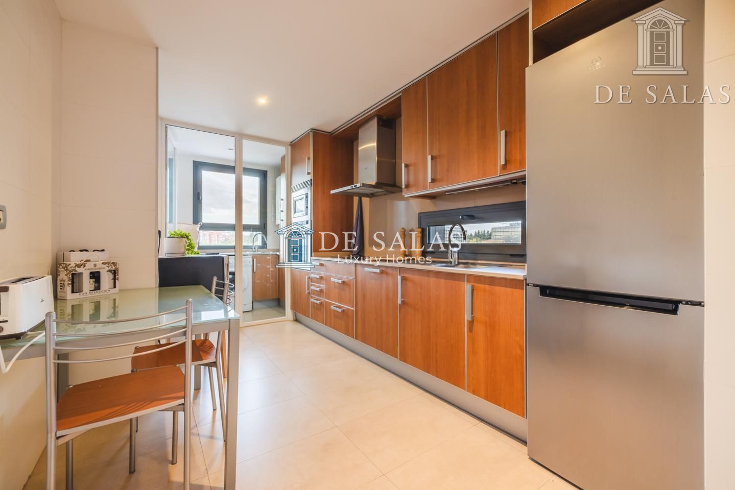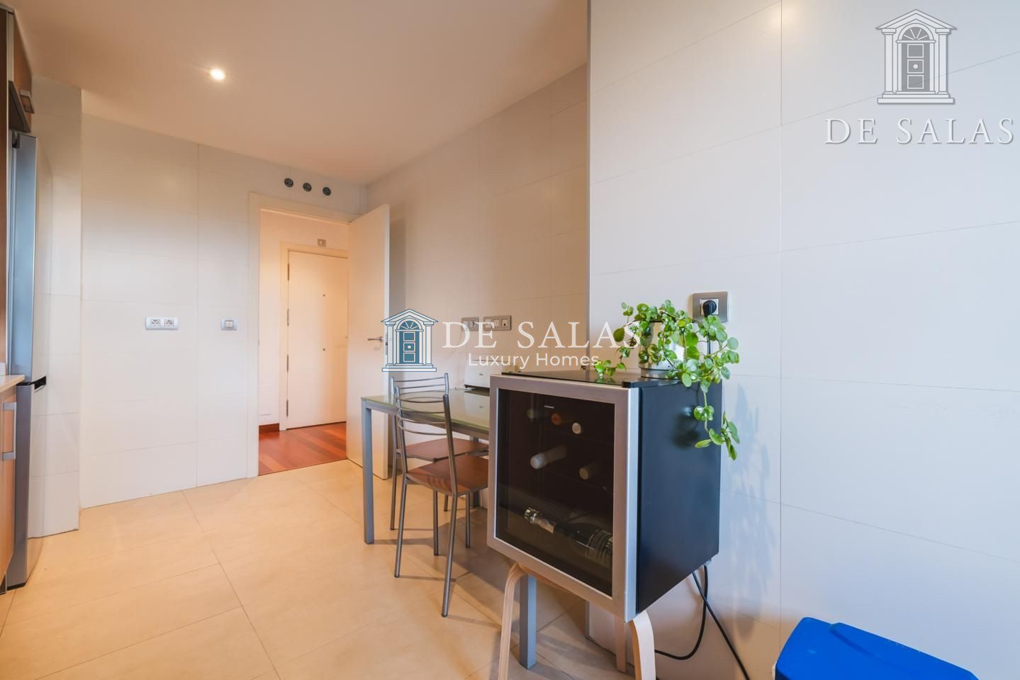 La cocina cuenta con electrodomésticos integrados y tiene una zona office con espacio para una mesa en la que pueden comer cómodamente hasta cuatro personas. Junto a la cocina encontramos un práctico lavadero-tendedero.