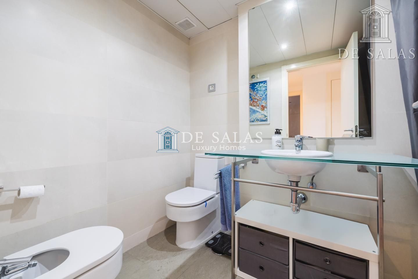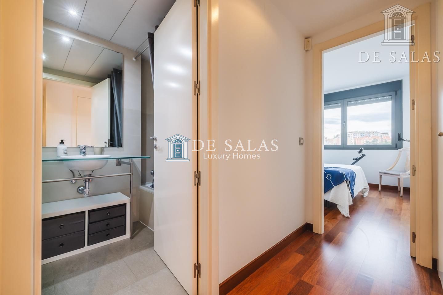 Ya en la zona de noche se encuentra el dormitorio con armarios empotrados totalmente revestidos, junto al cuarto de baño con bañera y encimera en un elegante cristal al ácido.
