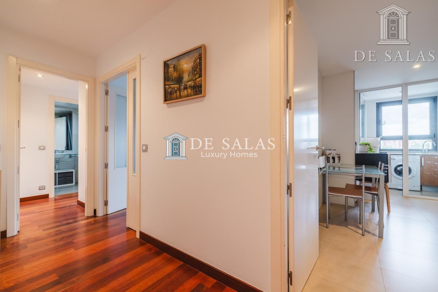 El piso, de magníficas calidades de construcción, tiene el suelo de tarima de madera, carpintería interior lacada en color blanco, ventanas oscilobatientes de aluminio con doble acristalamiento climalit.
