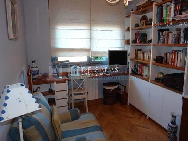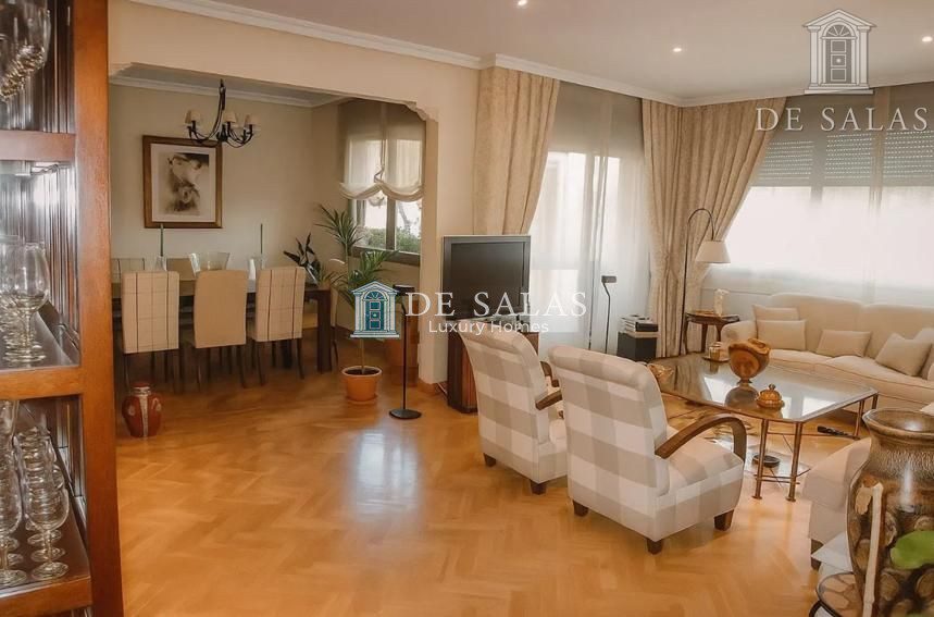 La distribución de la vivienda constaba originalmente de 4 Habitaciones, una de ellas ha sido destinada a Comedor, obteniendo un Salón-Comedor muy amplio con grandes ventanales que además cuenta con una terraza con vistas al interior de la urbanización. Tiene una librería hecha a medida y dispone además de un Baño de mármol para visitas.